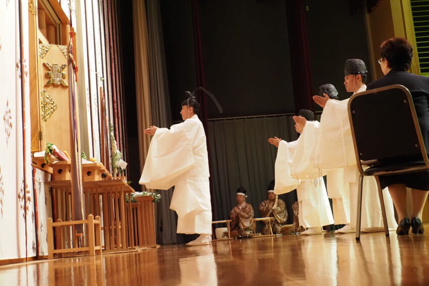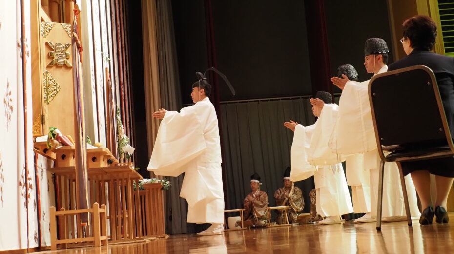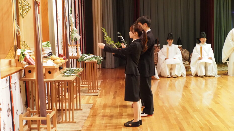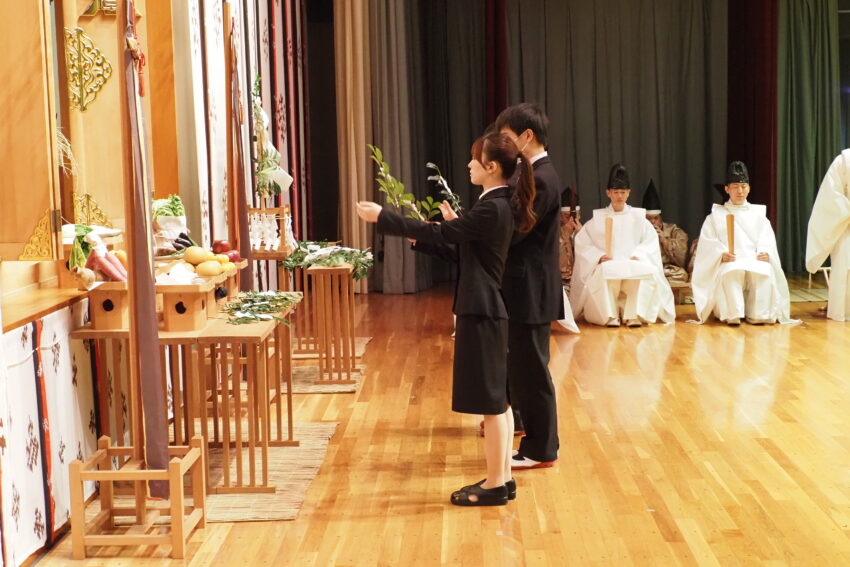 奉告祭は神道の祭儀に則って斎行され、祝詞奏上、玉串奉奠・拝礼では、太田映子学園理事長、後藤正人短期大学長、實島範朗中学高等学校長、中山年江幼稚園長が代表して玉串を奉奠し、参列者もそれに合わせて拝礼しました。