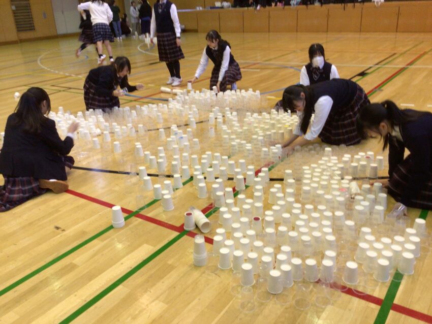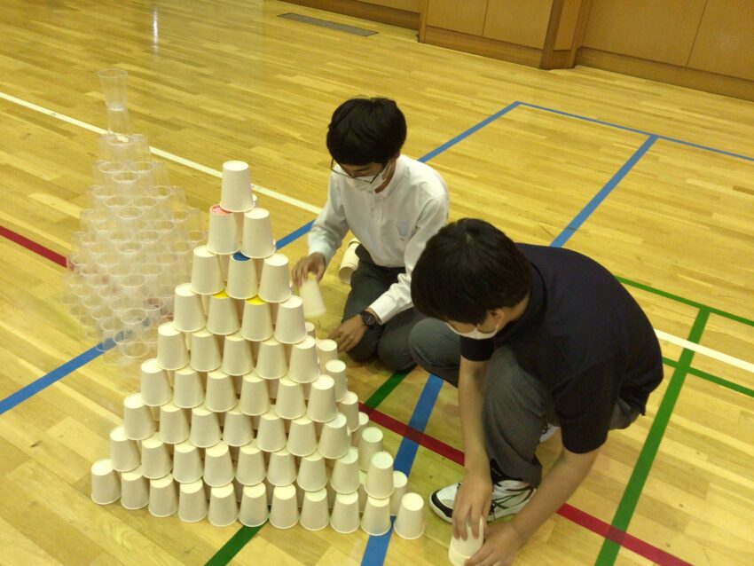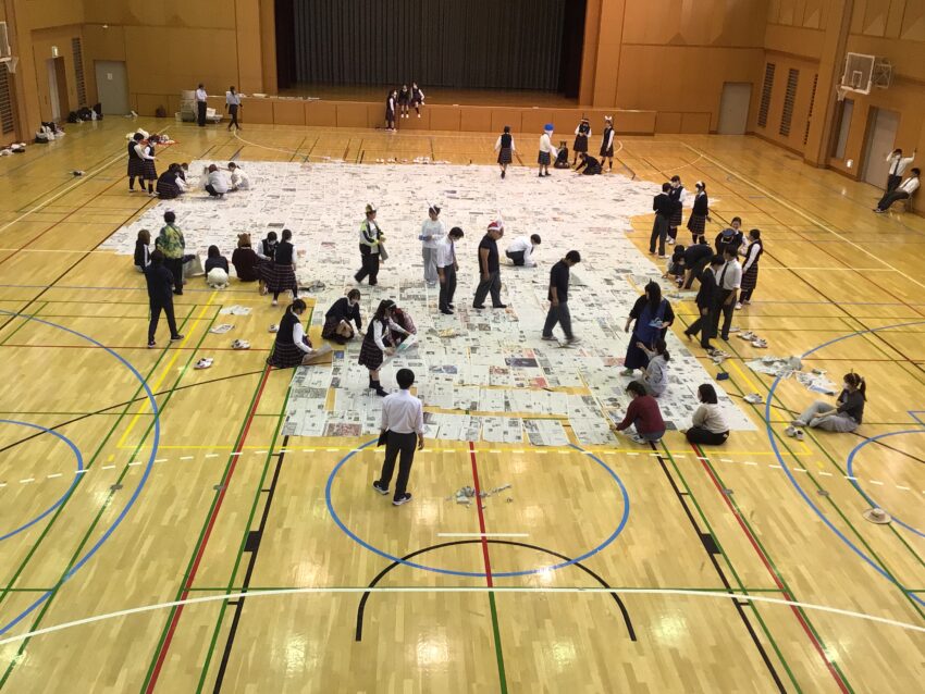 紙コップを用いた活動では床一面に並べて絵を描いてみたり、高く積み上げたりしながらタワーを作成しました。また、新聞紙では全員で協力しながら、一枚の大きなじゅうたんを作成し、持ち上げたり中に入ってみたりと、中学生と短大生が互いにコミュニケーションを取り合いながら、活動をしていました。