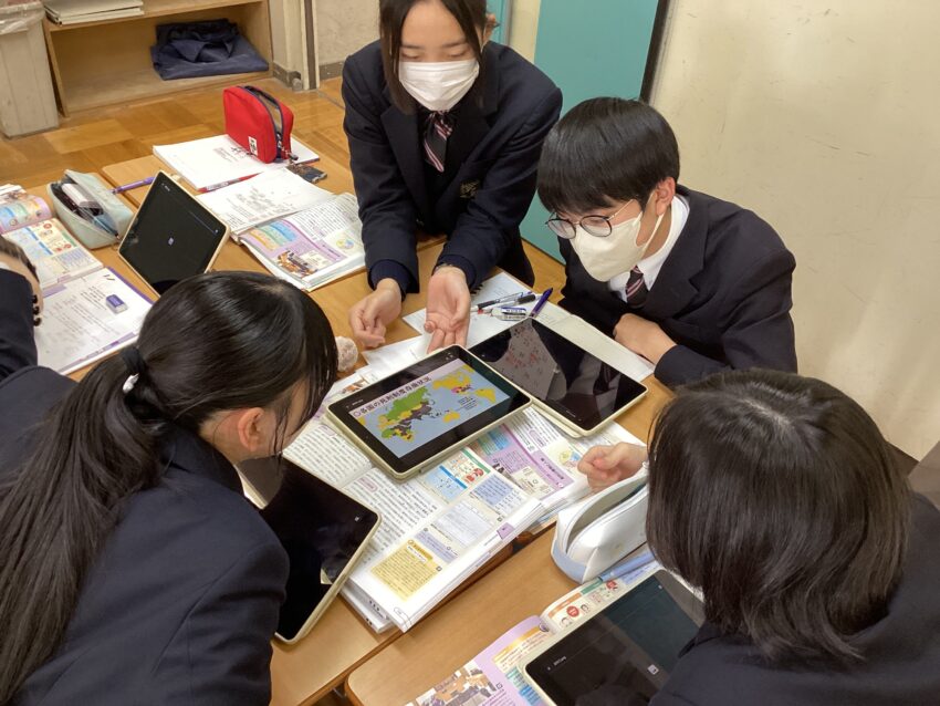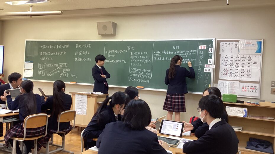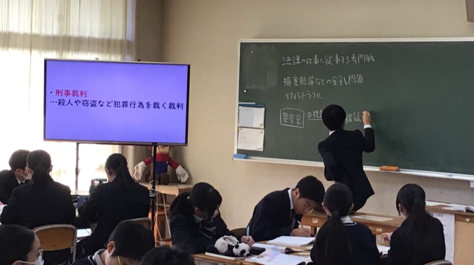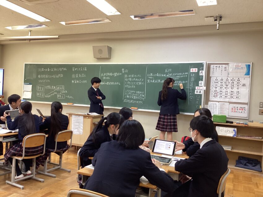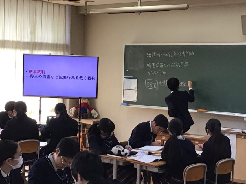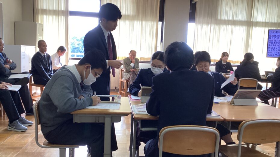 2025.10.31中学校【中学】地歴公民科後期研究授業(中学校・社会科)令和7年10月29日(水)1限 中学3年1組 木城先生による地歴公民科の研究授業が行われました。今回は、裁判の制度と仕組みを踏まえ、裁判の種類や裁判官・検察官・弁護士の働きを通して、人権がどのように守られているのかを理解することを目標とした授業でした。授業の後半には、死刑制度をテーマにしたグループワークが行われ、活発な意見交換がなされました。