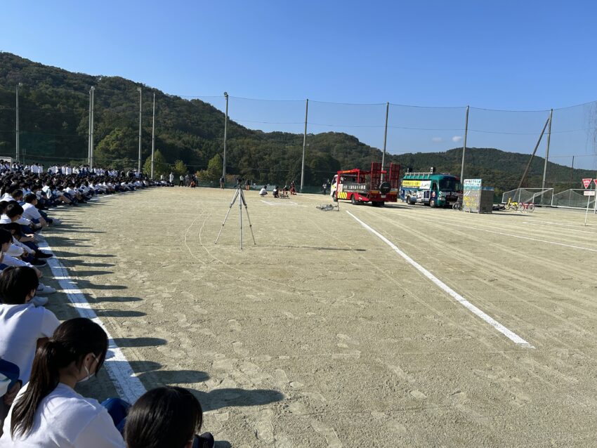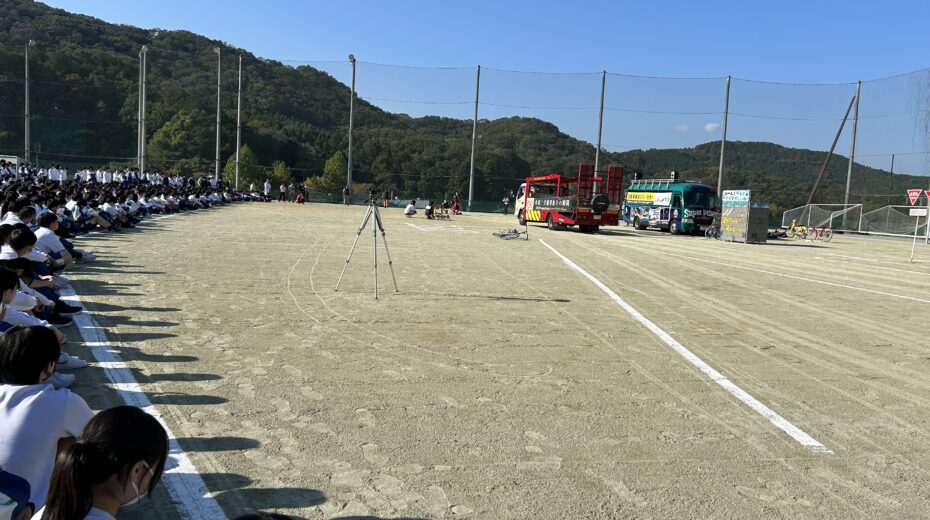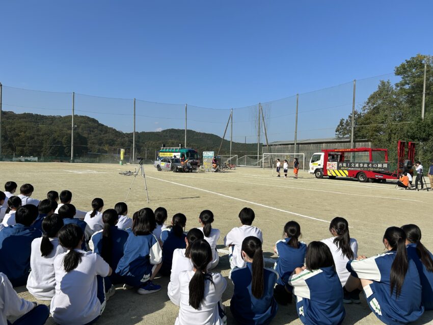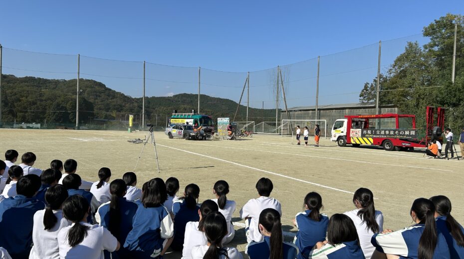 2025.10.31中学校高等学校スケアード・ストレイト方式による交通安全教室令和7年10月30日(木)第1グラウンド 中学高校生全学年を対象に、JA共済交通安全教室が5・6限に行われました。下野農業協同組合常務理事猿山康弘様からのご挨拶のあと、スーパードライバーズさんによる司会でプログラムは進行し、その迫力ある事故再現に多くの生徒が声を上げて驚いていました。生徒参加型の場面もあり、自転車のルールを確認するよい機会となりました。