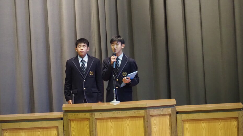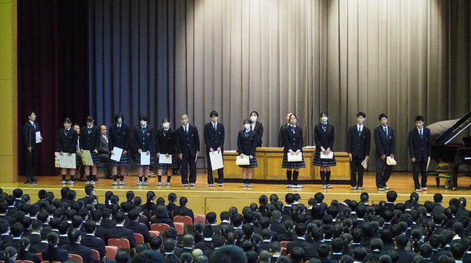 1時間目に、11月の全校朝礼が行われました。校歌斉唱は、鈴木莞太さん(文理3年)の伴奏のもとで行われ、校長講話では、本校卒業生の実体験を踏まえながら「準備」と「振り返り」の重要性についてお話がありました。各種表彰では、國學院祭文化祭、書道部、柔道部などの表彰が行われました。