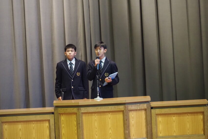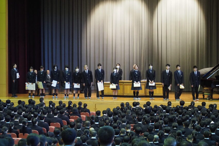 1時間目に、11月の全校朝礼が行われました。校歌斉唱は、鈴木莞太さん(文理3年)の伴奏のもとで行われ、校長講話では、本校卒業生の実体験を踏まえながら「準備」と「振り返り」の重要性についてお話がありました。各種表彰では、國學院祭文化祭、書道部、柔道部などの表彰が行われました。