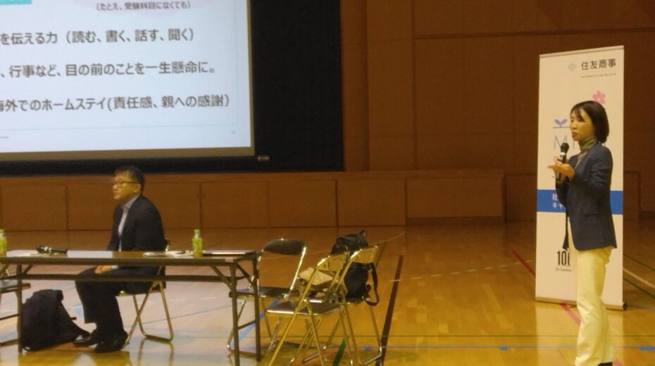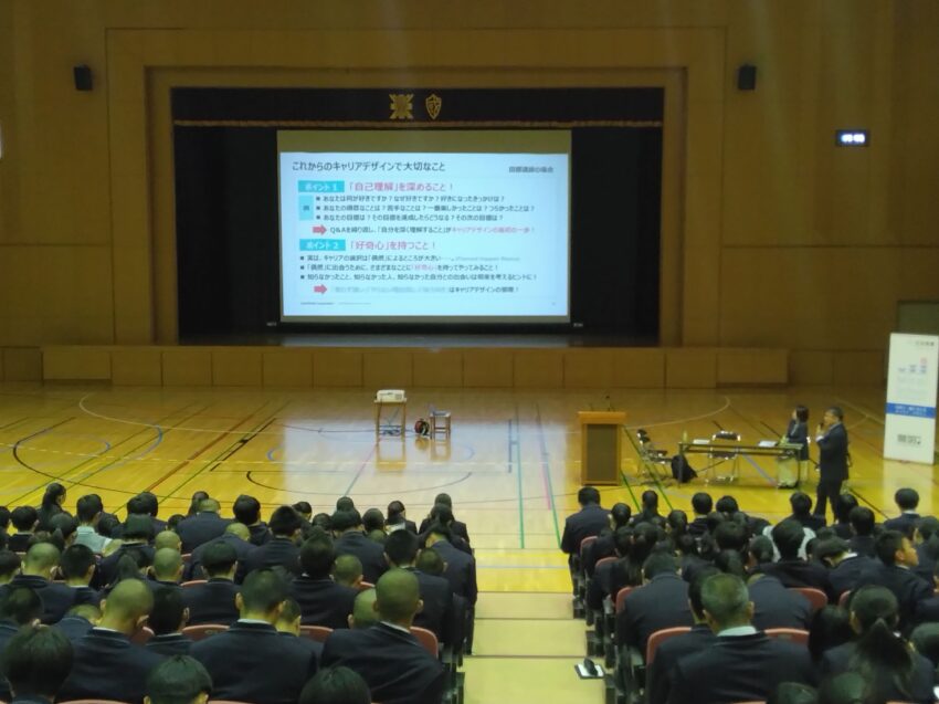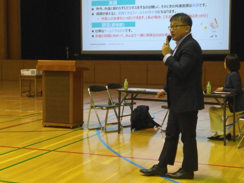 講演では、講師の方々が自身の生徒・学生時代の様子や意識、現在のお仕事などについて自己紹介の形で語られ、その経験から「社会に出てからの学力と学校の授業との関係」「好奇心を持ち挑戦することの大切さ」「英語の有用性」などが強調されました。