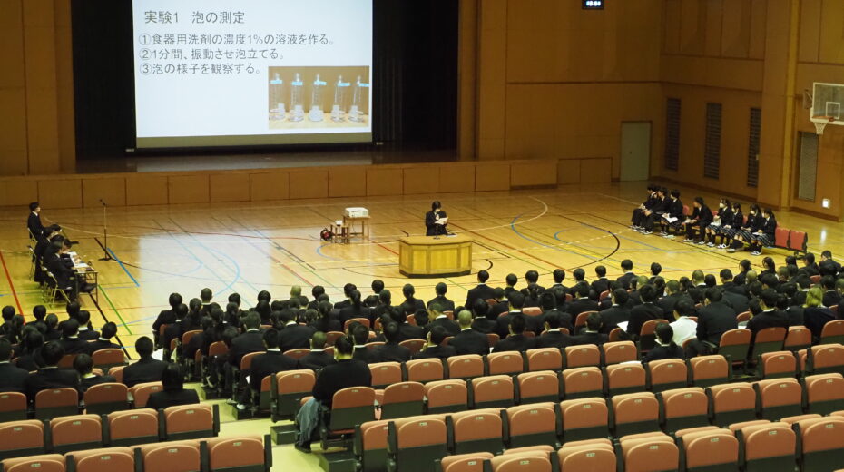 発表者たちのテーマは、若者や社会が抱える問題、将来の職業に関連する内容など多岐にわたり、実験結果がわかりやすくまとめられ、考察もよく練られていました。発表者たちの真剣な態度や発表の様子に、聴衆の生徒たちもしっかりと耳を傾け、学びの多い充実した会となりました。