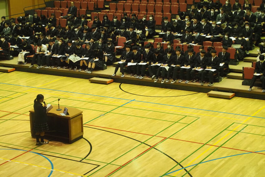 総合的な探究の時間などを使い、個人で設定したテーマに沿って進めてきた探究活動の集大成です。各クラスから1人ずつ代表が選ばれ、計10名が発表を行いました。