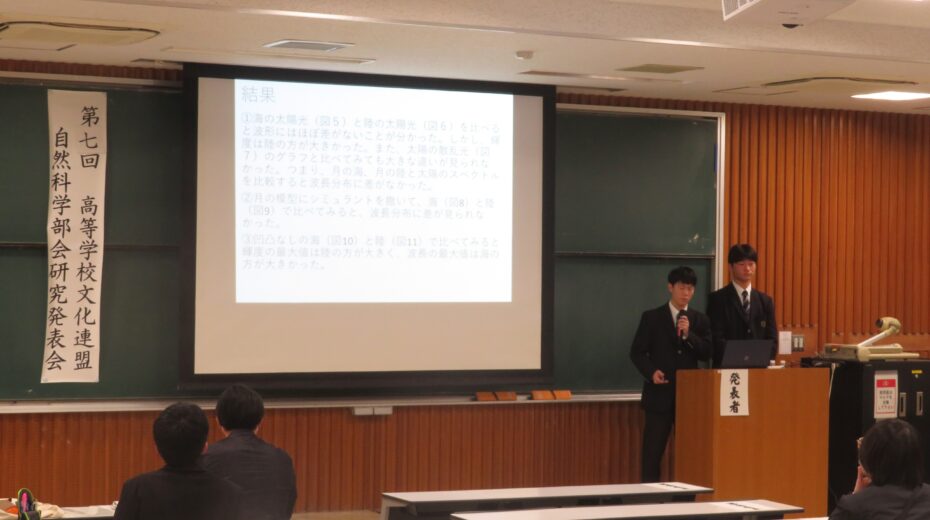 12月13日(土)、宇都宮大学峰キャンパスにおいて「第7回栃木県高等学校文化連盟自然科学部門研究発表会」が開催され、県内16の研究団体が参加しました。本校天文部は、「月の表面のスペクトル」を題目に、身近な月のクレーターや平地の光を分析するとともに、地形模型を作成し、シミュレーションによる成果を発表しました。