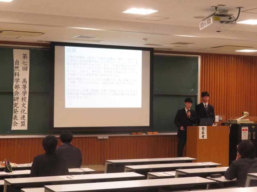 12月13日(土)、宇都宮大学峰キャンパスにおいて「第7回栃木県高等学校文化連盟自然科学部門研究発表会」が開催され、県内16の研究団体が参加しました。本校天文部は、「月の表面のスペクトル」を題目に、身近な月のクレーターや平地の光を分析するとともに、地形模型を作成し、シミュレーションによる成果を発表しました。