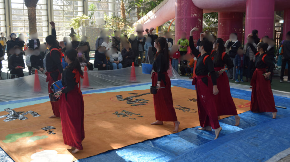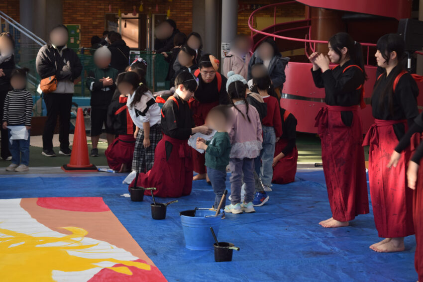今年は「昨年、一昨年のパフォーマンスを見て、参加したくて来ました!」という方もおり、このパフォーマンスが地域の方々に愛され、親しんでいただいていることを実感できました。書き上げた2作品のうち1作品は、こどもの城ステージ壁面に1月いっぱい展示されます。作品とともに、ぜひご覧ください♪