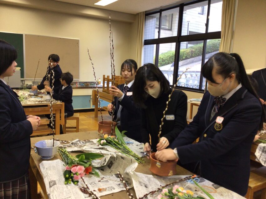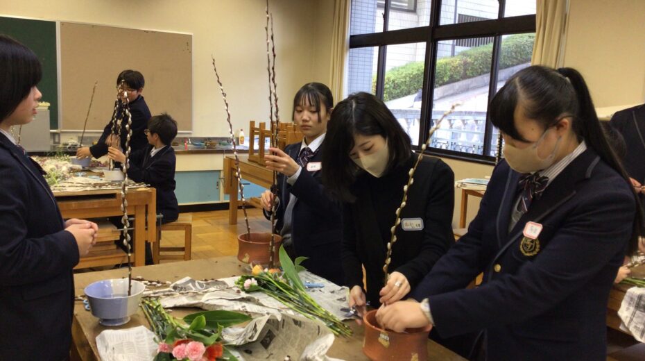 中学1年生を対象にした華道教室が行われました。本校華道部顧問で、流生派の白石蕉葉先生のご指導のもと、植物の「貌(かお)」を生かした生け花に生徒たちが取り組みました。