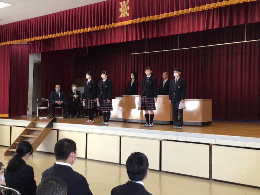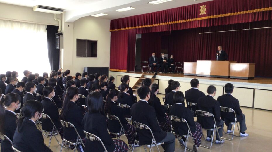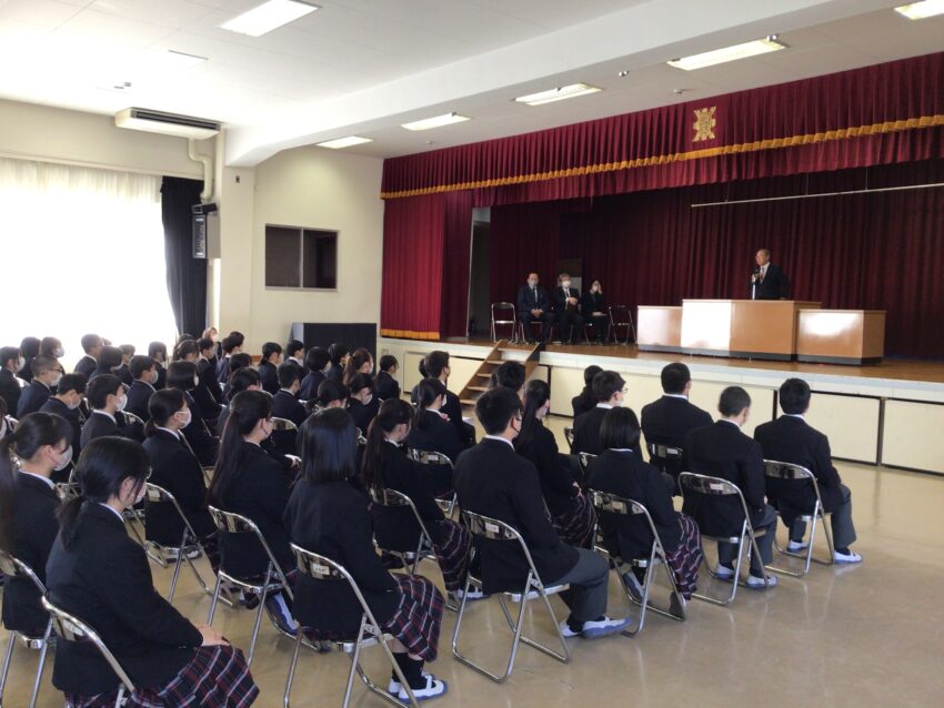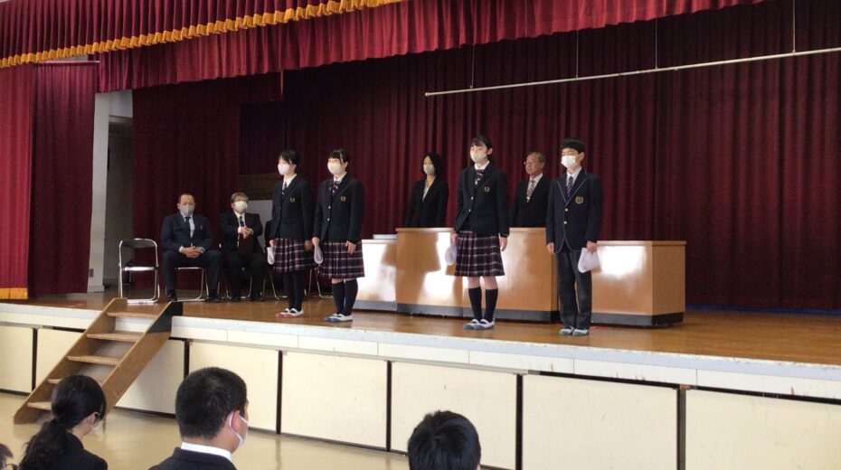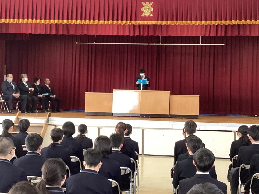 2月の中学校朝礼が行われました。インフルエンザ感染予防の観点から、校歌斉唱は実施されませんでした。朝礼では、各種表彰に続き、2年生の溝江祐夢さんによる立志式の作文(立志の詞)の発表がありました。校長講話では、本校3年生やプロ野球選手となった卒業生の実体験をもとに、「経験」と「言葉」の大切さについてお話がありました。