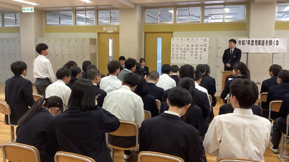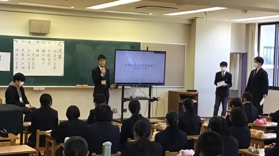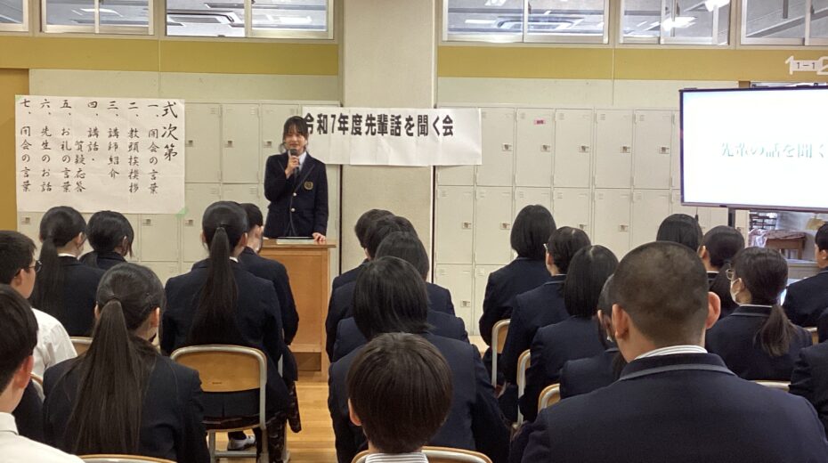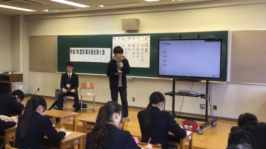 春期講習初日の午後に、先輩の話を聞く会が行われました。音楽室では、先日本校を卒業し、春から大学生になる金子さんと白久さんが中学3年生に話をしてくれました。お二人は、大学受験に臨む上での姿勢や日常生活で意識したこと、効果的な勉強方法などについて説明してくれました。