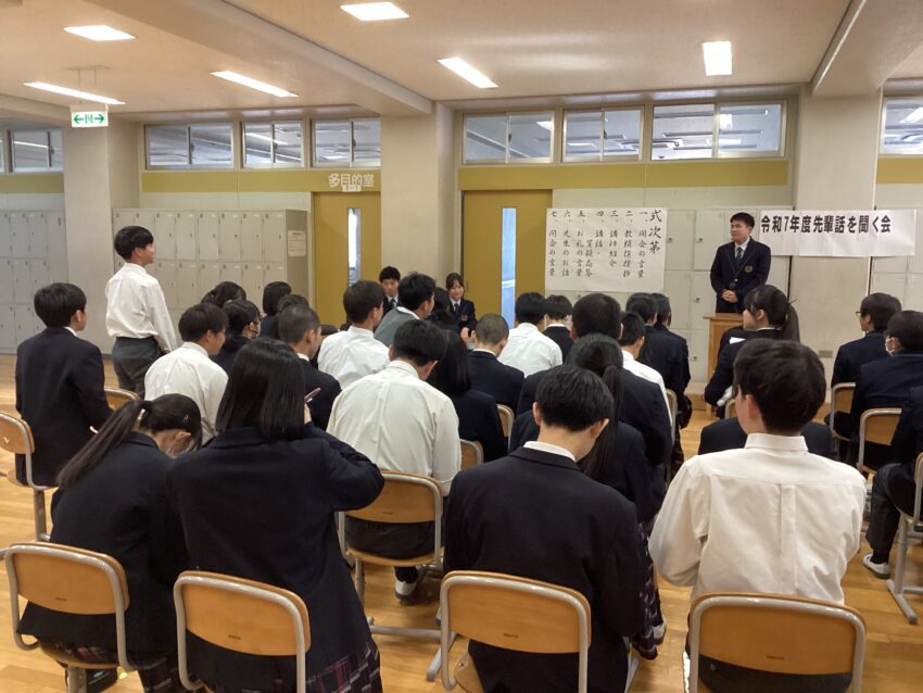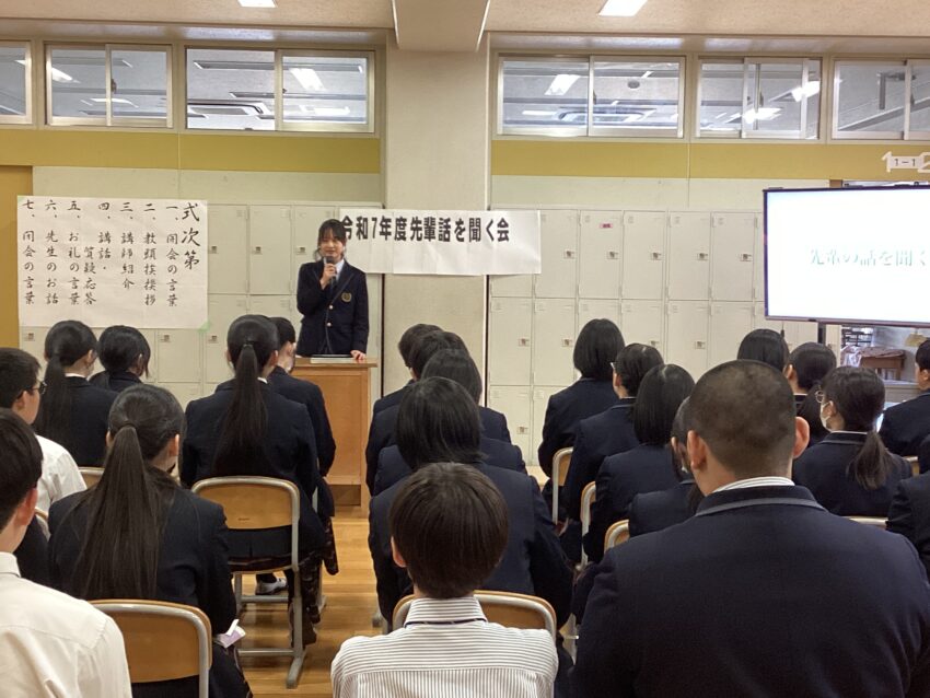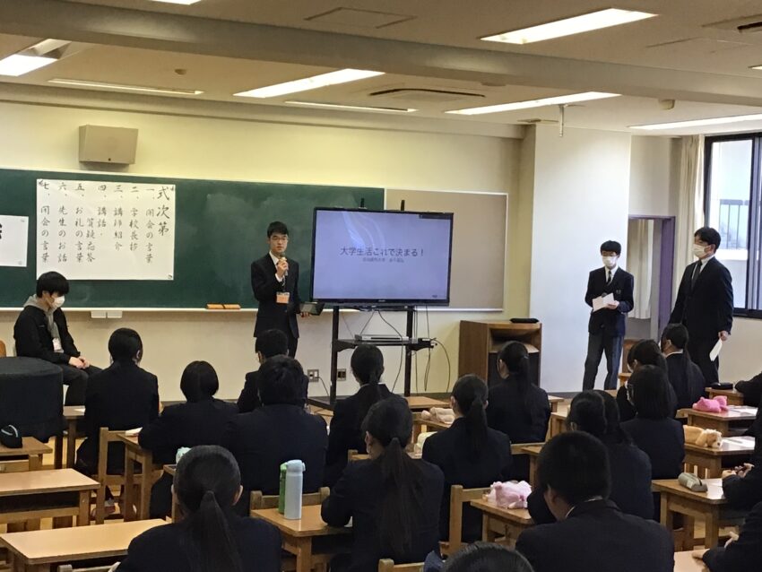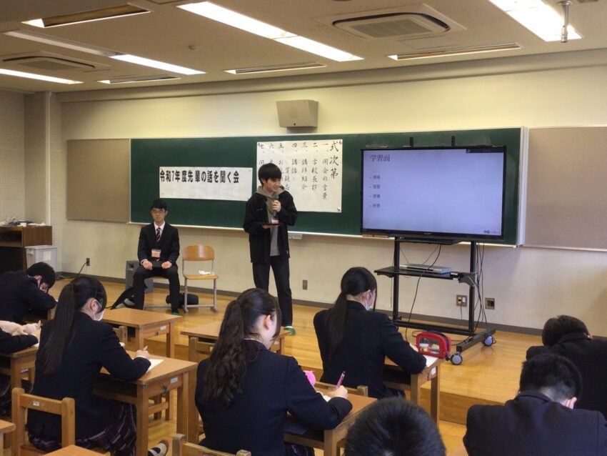 春期講習初日の午後に、先輩の話を聞く会が行われました。音楽室では、先日本校を卒業し、春から大学生になる金子さんと白久さんが中学3年生に話をしてくれました。お二人は、大学受験に臨む上での姿勢や日常生活で意識したこと、効果的な勉強方法などについて説明してくれました。